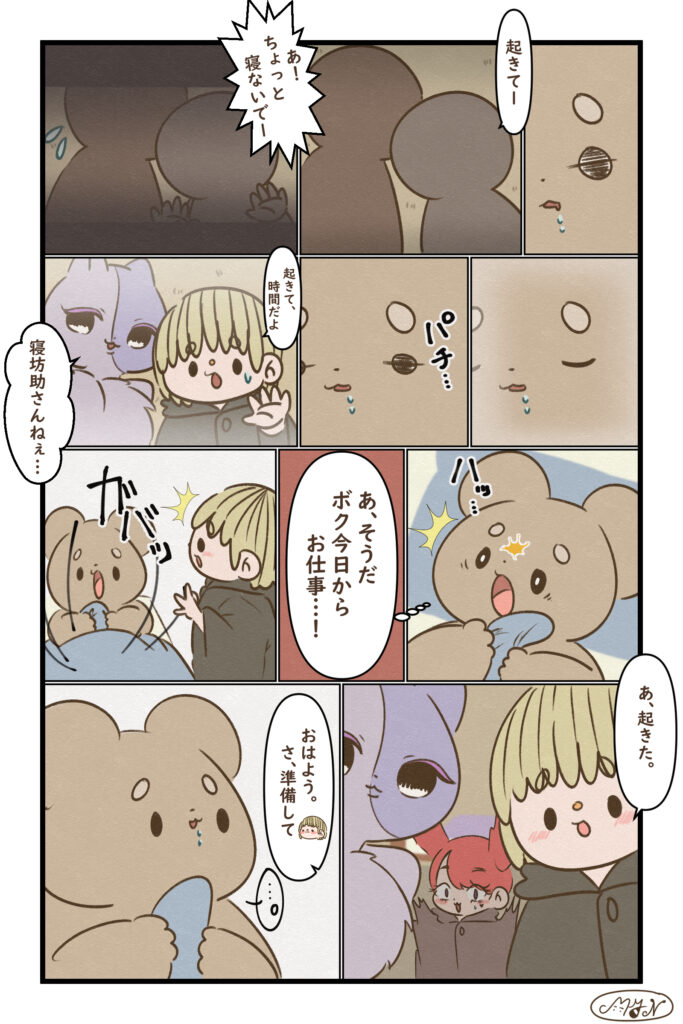 「ウサノ」シリーズ 前回のお話 今回のお話 第46話 にぎやか…? なによー!うるさくなんかないもん!…でもちょっとやりすぎた?って反省してるみたいだった素直で、にぎやかで、案外いい子なのかも。 第47話 はじめまして 仲間への、はじめての自己紹介。勇気を出したウサノに、返ってきたのは——たった一言。でも、あたたかい「よろしく」でした。 第48話 安心…? にっこり笑って「安心しなさい」って。…でも、なんでだろう。ちょっとだけ胸がざわつく。 おまけ 次回のお話 以下のサイトで漫画を公開中です! MYN(マ ...