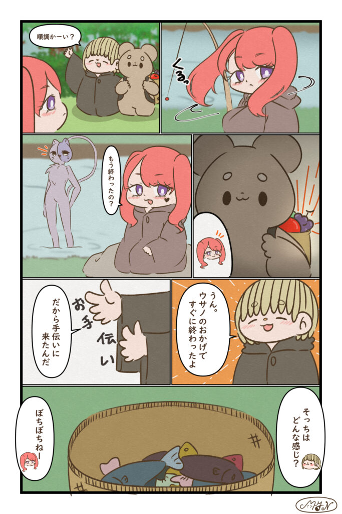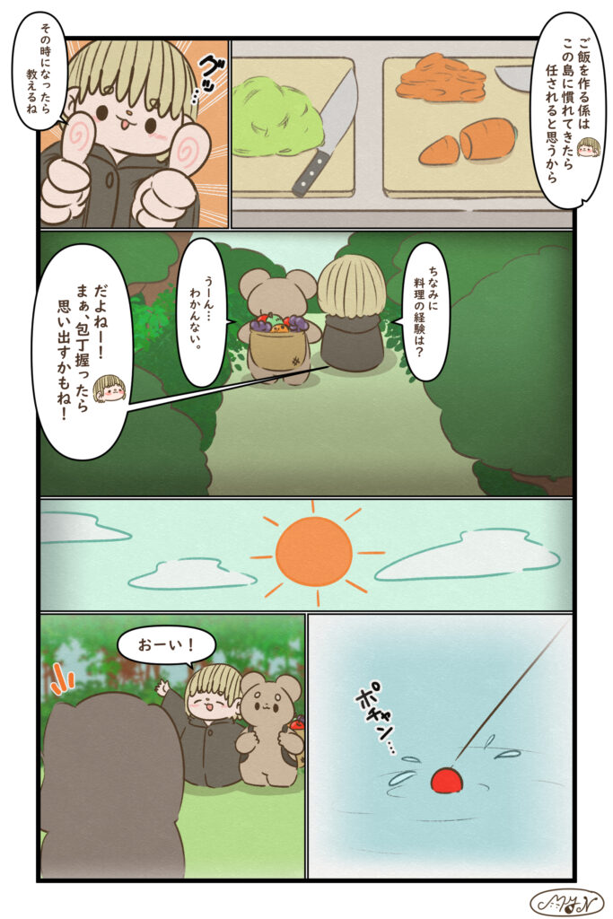 「ウサノ」シリーズ 前回のお話 今回のお話 第69話 包丁を握ったら 料理の係は、島に慣れたら任されるらしい。ウサノの記憶も、少しずつ戻るきっかけがあるのかも🍳 第70話 お手伝い みんなで力を合わせて、食べもの集め中!今日はお魚チームもがんばってるみたい🐟✨ おまけ 次回のお話 準備中 以下のサイトで漫画を公開中です! MYN(マイン)Officialブログ以外に、以下のサイトで漫画を公開しております。 使い慣れたwebサイトを使って、MYN(マイン)の漫画 ...