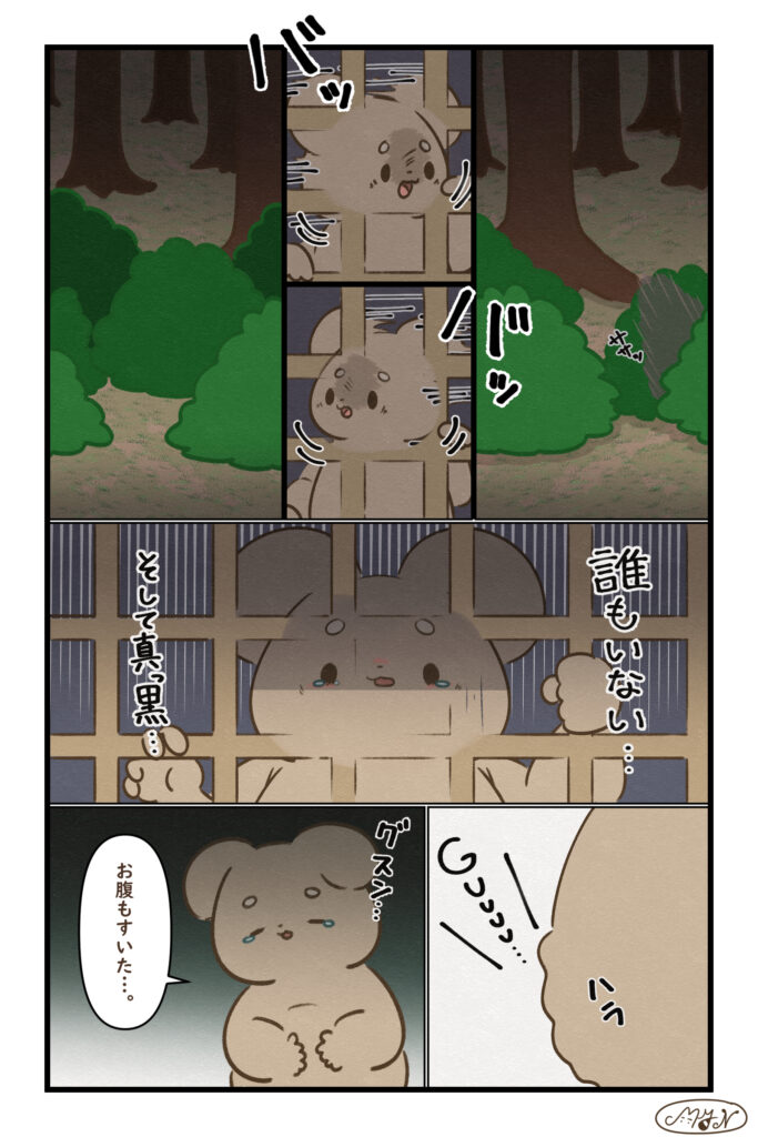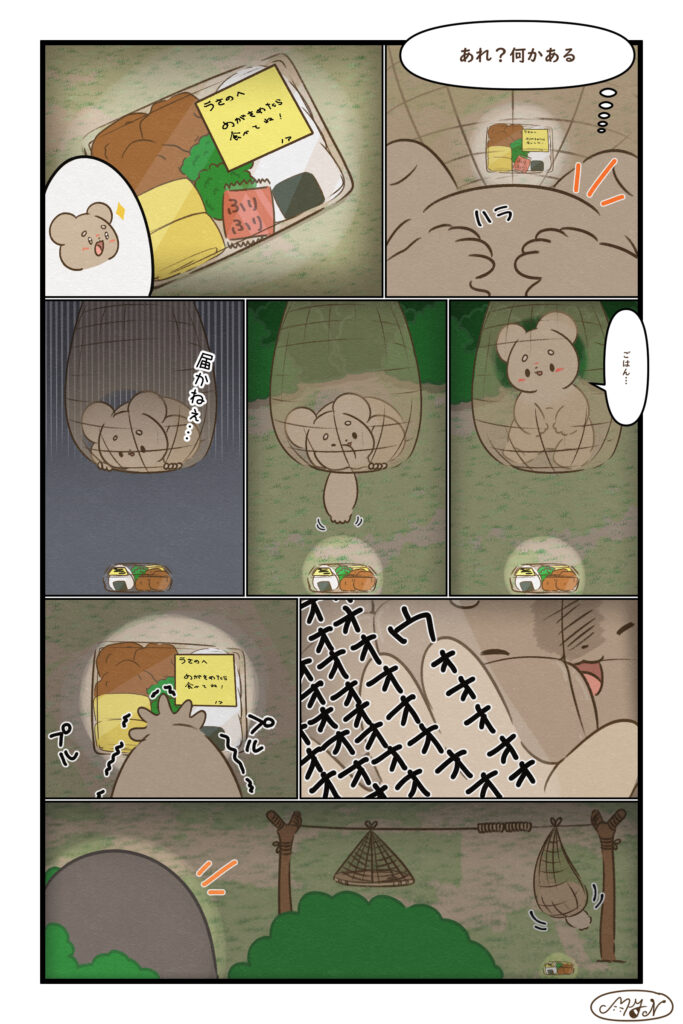 「ウサノ」シリーズ 前回のお話 今回のお話 第84話 誰もいない 気づいたら、あたりはもう真っ暗…。ノアもニャゴ助もいなくて、ウサノはひとりぼっち。お腹…すいた…。 第85話 お弁当 お弁当を見つけて嬉しそうなウサノ。でも高さがあってなかなか手が届かない…!ぷるぷるしながら頑張るけど… おまけ そうだよ← 次回のお話 準備中 以下のサイトで漫画を公開中です! MYN(マイン)Officialブログ以外に、以下のサイトで漫画を公開しております。 使い慣れたwebサイトを使って、MYN(マイン)の漫画をお楽し ...