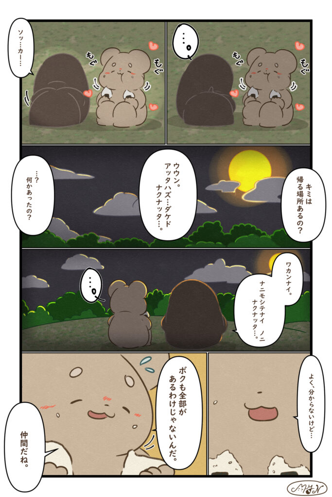 「ウサノ」シリーズ 前回のお話 今回のお話 第89話 はじめての会話 助けてくれた“謎の子”と、ついに言葉を交わすウサノ。でもその子の言葉は、どこか不思議なイントネーションで──? 第90話 帰る場所 ぽつりとこぼれた“あの子”の悲しい事情。「カエルバショ…ナクナッタ…」その言葉に、ウサノは――。 おまけ 食糧庫の中のイメージイラスト 次回のお話 準備中 以下のサイトで漫画を公開中です! MYN(マイン)Officialブログ以外に、以下のサイトで漫画を公開しております。 使い慣れたwebサイトを使って、 ...