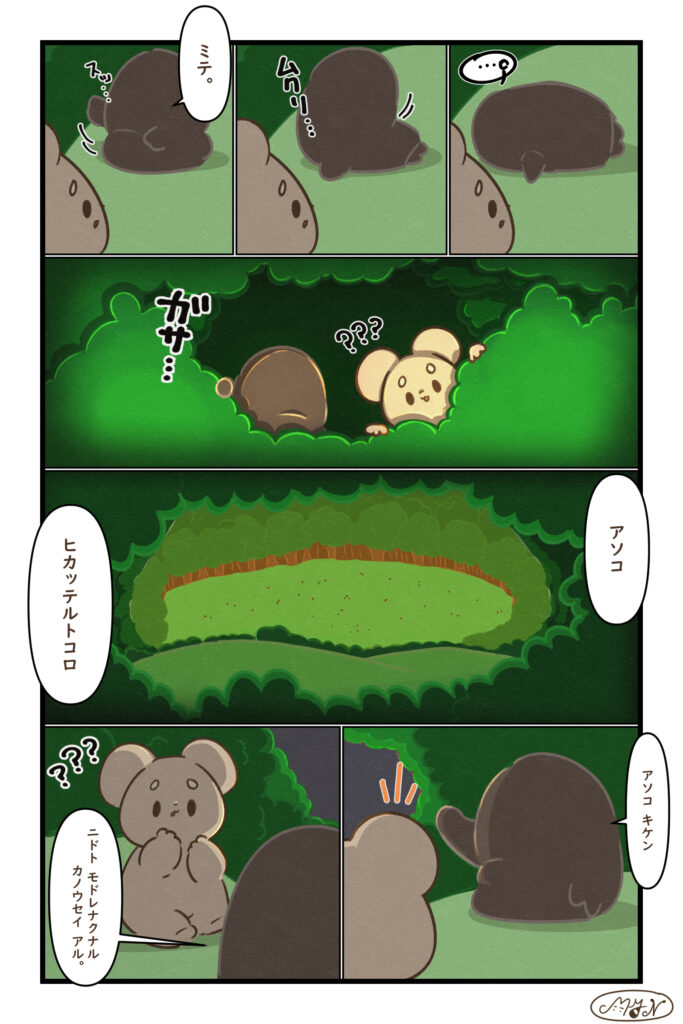 「ウサノ」シリーズ 前回のお話 今回のお話 第94話 あの音は― 「また会おう」そんな約束をした二人。しかし、例の鐘の音が響き渡る。 第95話 イソイデ! 夜の森、遠くで鳴る鐘の音。 よく分かっていないウサノの手を、 キミ」は強く引いて走り出す。 おまけ 実は崖でした 次回のお話 以下のサイトで漫画を公開中です! MYN(マイン)Officialブログ以外に、以下のサイトで漫画を公開しております。 使い慣れたwebサイトを使って、MYN(マイン)の漫画をお楽しみください! ニコニコ漫画 制作・監修