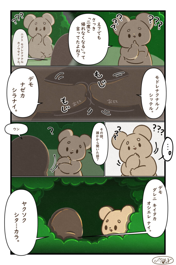 「ウサノ」シリーズ 前回のお話 今回のお話 第99話 ヨク ワカラナイ 森の奥にある、あの光。「キミ」は危険だと伝えようとするけれど、その理由は——。 第100話 ヤクソク キミは「アレは危ない」と言う。でも、その理由はよく分からない。それでも、誰かとの約束は覚えている。 おまけ 次回のお話 準備中 以下のサイトで漫画を公開中です! MYN(マイン)Officialブログ以外に、以下のサイトで漫画を公開しております。 使い慣れたwebサイトを使って、MYN(マイン)の漫画をお楽しみください! ニコニコ漫画 ...