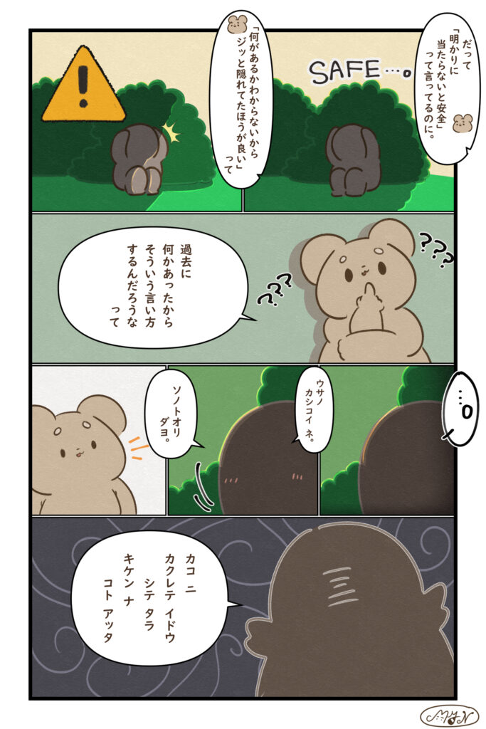 「ウサノ」シリーズ 前回のお話 今回のお話 第101話 そっかー。 あの明かりが危ない理由は、よく分からないまま。でもこの明かりは、朝まで消えないらしい…… 第102話 危険 危ない理由は、いまいち分からない。それでも「当たらない」「隠れる」それが約束だから。 第103話 過去 「明かりがついたら準備する」それが伝承。でも――過去に、何があった? おまけ 次回のお話 準備中 以下のサイトで漫画を公開中です! MYN(マイン)Officialブログ以外に、以下のサイトで漫画を公開しております。 使い慣れたw ...